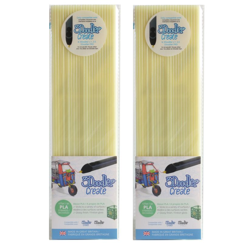 3Doodler Create PLA Plastic Glow In The Dark - 2Pack - For those who love the look of the translucent and glossy finish on their doodles the key to creating those beautiful designs are PLA plastics! It cools at a lower temperature and has the ability to stick to paper glass cloth and metal surfaces. You can even manipulate the plastic for a few seconds right after doodling. The possibilities are endless! Explore the wide variety of 3Doodler plastic refill colours and finishes including clear metallic sparkle! PLA plastics are compatible with the 3Doodler Create+ Create 2.0 and V.1 3D printing pens. In addition, it is easy to clean up and safe to Doodle on almost any material without damage. Available in single & mixed colour pack containing 25 strands and single colour tubes containing 100 strands.