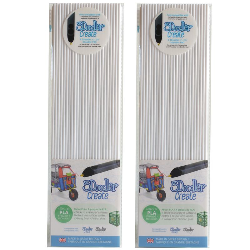 3Doodler Create PLA Plastic Snow White - 2Pack - For those who love the look of the translucent and glossy finish on their doodles the key to creating those beautiful designs are PLA plastics! It cools at a lower temperature and has the ability to stick to paper glass cloth and metal surfaces. You can even manipulate the plastic for a few seconds right after doodling. The possibilities are endless! Explore the wide variety of 3Doodler plastic refill colours and finishes including clear metallic sparkle! PLA plastics are compatible with the 3Doodler Create+ Create 2.0 and V.1 3D printing pens. In addition, it is easy to clean up and safe to Doodle on almost any material without damage. Available in single & mixed colour pack containing 25 strands and single colour tubes containing 100 strands.3Doodler Create PLA Plastic Snow White