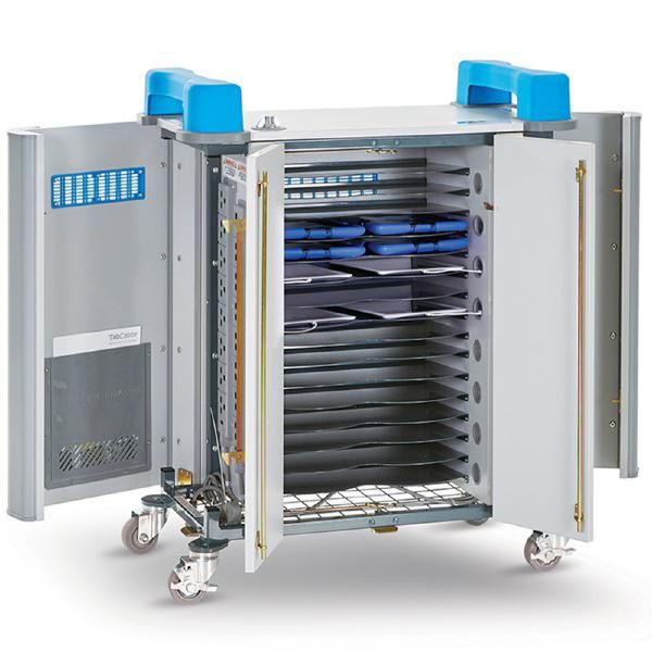 The 'TabCabby 32 Horizontal Compact' charges 32 Tablets up to 12"; screen size including their protective cases. The horizontal storage shelves store two devices side by side within a compact footprint. The TabCabby offers fast, flexible and simultaneous charging with a programmable timer. Maximum security safety is guarenteed with dual point locking system and separate lockable power compartment. It's easy to move with ergonomic top handles, rounded corner bumpers and multi-directional non-marking wheels. The TabCabby offers silent charging with unique ventilation system and a built-in heat sensor shuts off power automatically if over-heating occurs.