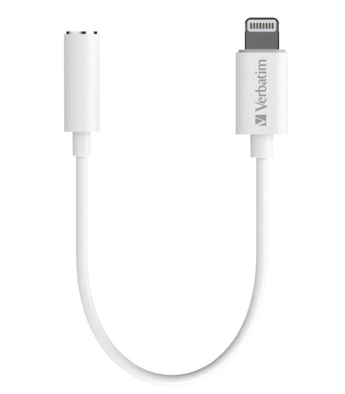 Verbatim Lightning to 3.5mm Headphone Jack 10cm - White Specification ÃÃ Apple MFi certication ensures quality and charge compatibility with applicable Apple devices. ÃÃ Oxygen-free copper wire delivers crystal clear sound quality audio transfer. ÃÃ Frequency response: 20Hz - 20KHz. ÃÃ Support 24 bit hi-res audio. ÃÃ Material: ABS, PVC, TPE. Features & Benefits ÃÃ Connects headphones to your Apple products that are missing a headphone jack. ÃÃ Quality ÃÃ MFi Certified giving peace of mind that your cable is manufactured to the high Apple standards and will not damage your device. The oxygen-free copper wire delivers crystal clear highquality audio for your listening pleasure