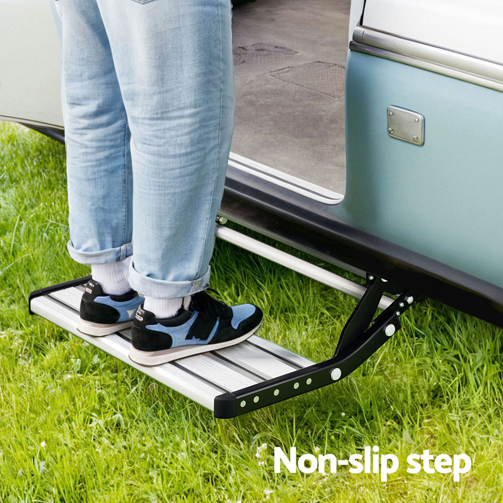 Make your travel more convenient with our Weisshorn RV Folding Step. Made from heavy-duty aluminium and solid steel materials, the folding step provides a smooth platform. It is easy to manually retract, just pull the unit out and let the spring lock into place. The safe, anti-slip design prevents falls, so you can get into your vehicle with ease. It provides safe, fast and comfortable entry to your recreational vehicle, bringing amazing convenience on the road. Have a Weisshorn RV Folding Step at the ready!